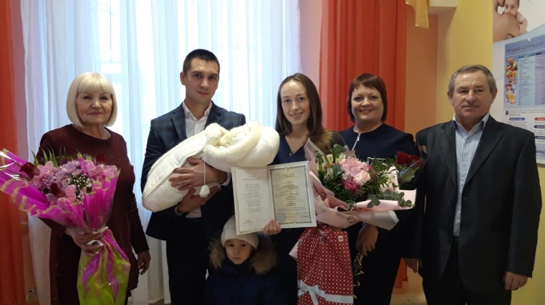 Бәхетле ата-аналар: Байрашевлар, Овсянниковлар һәм Федоровлар гаиләләре ГХАТ идарәсе белгечләре кулыннан беренче дәүләт документын – «туу турында таныклык» һәм Татарстан Республикасы Президенты Рөстәм Нургали улы Миңнехановның котлау хатын алдылар.