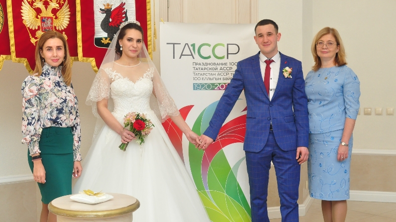 «Казан» Гаилә үзәгендә ТАССРның 100 еллыгы уңаеннан беренче яшь парлары – Илшат һәм Инзилә Әһлиуллиннарның никахларын теркәү тантанасы узды.