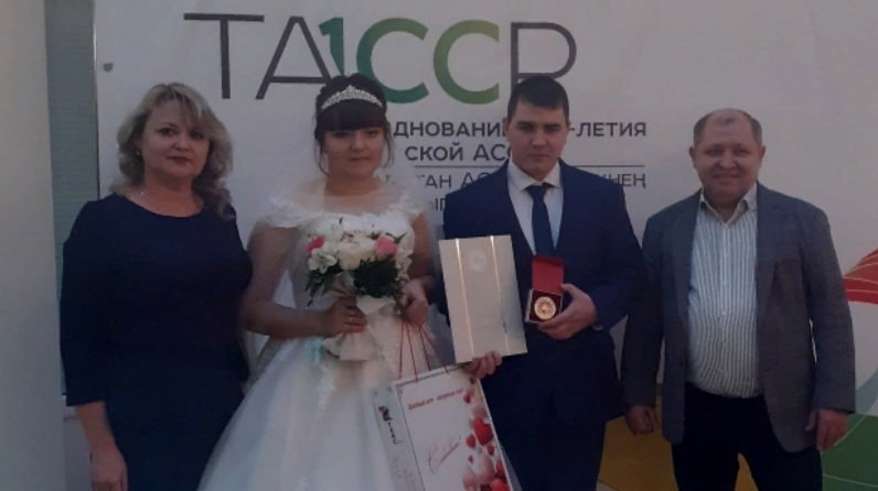 Яңа гаилә Тимур һәм Ландыш Юмановларга Кама Тамагы муниципаль районы исполком житәкчесе Загидуллин Ринат ТАССРның 100 еллыгын бәйрәм итү уңаеннан истәлекле билге һәм бүләк тапшарды. Яшләрне ГХАТ бүлеге җитәкчесе Халикова Елена котлады, матур теләкләрен җиткерде.