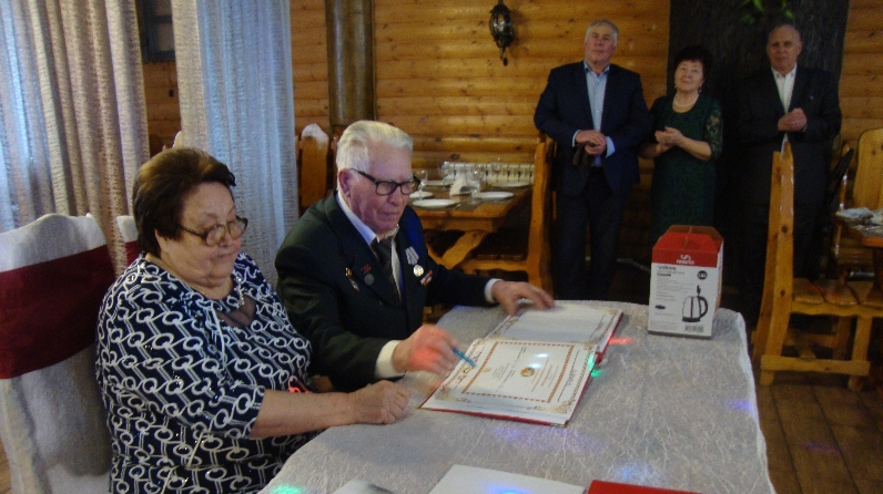ГХАТ бүлеге белгечләре гаилә парына ныклы сәламәтлек, гаилә иминлеге теләделәр, юбилярларга никах турында юбилей таныклык һәм Бөгелмә муниципаль районы башлыгы Линар Рөстәм улы Закировның котлау хатын тапшырдылар. Күркәм традиция буенча, алар Бөгелмә шәһәренең Мактаулы гаиләләре китабына үз имзаларын куйдылар.