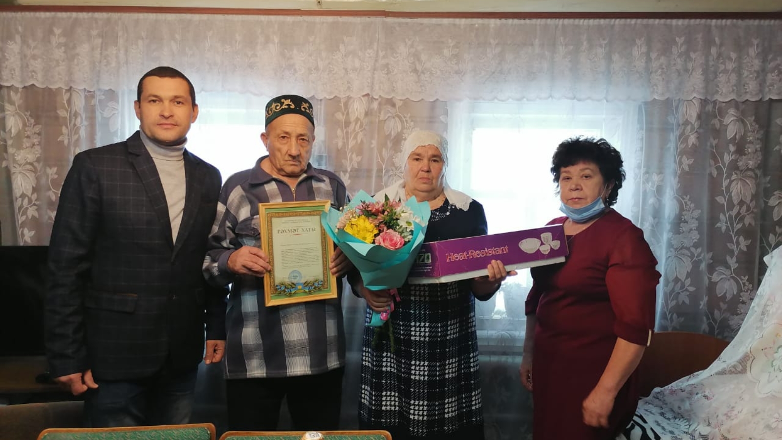 Дөбьяз авыл җирлеге Башкарма комитеты җитәкчесе Рамиль Шамил улы һәм Ветераннар Советы берләшмәсе рәисе Ильсия Мөхәммәтгариф кызы килде. Алтын туй билгеләп үтүче парларга котлаулар, истәлекле бүләкләр һәм Биектау районы ЗАГСы исеменнән Рәхмәт хаты тапшырылды.