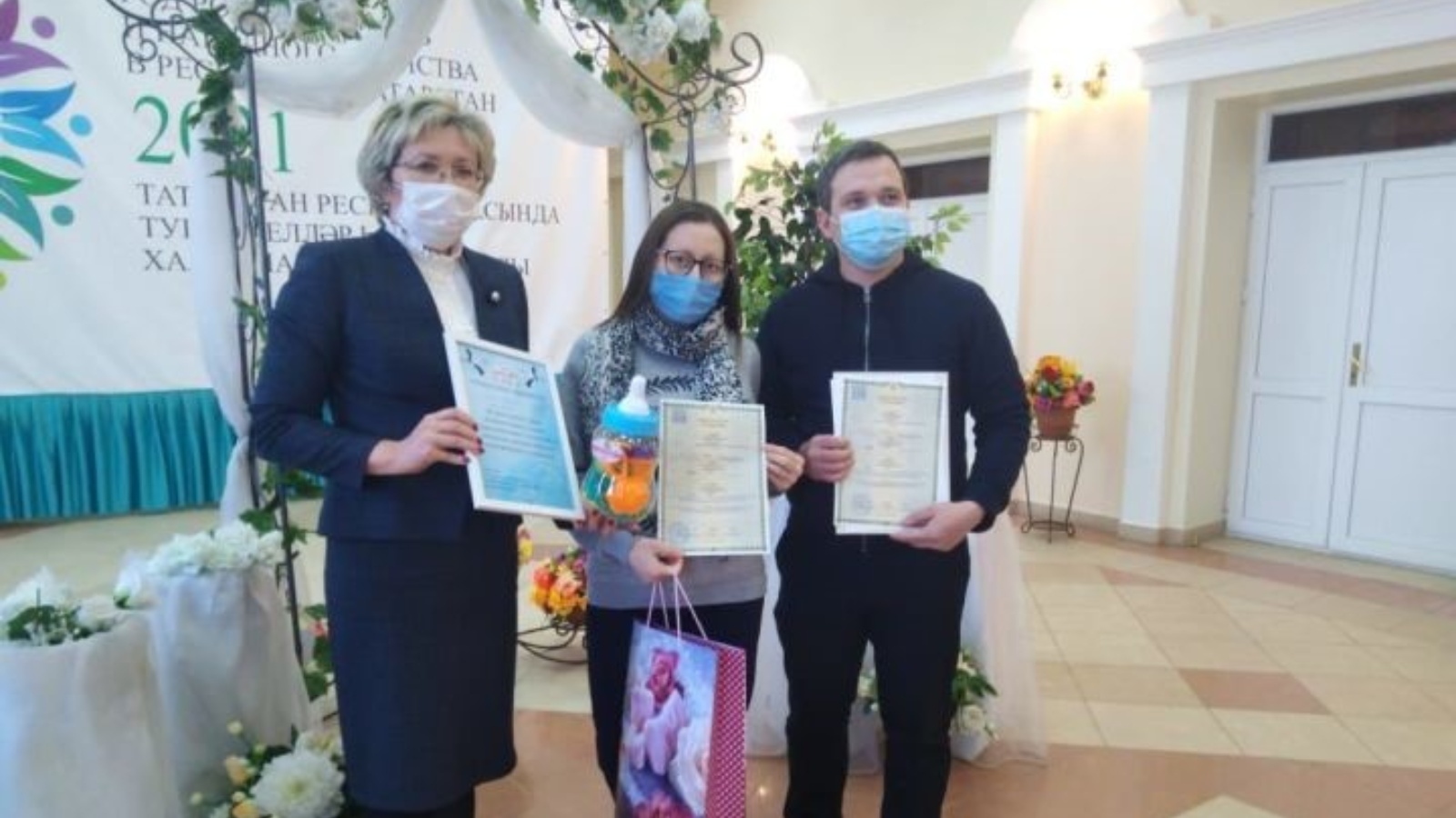 Яшь ата-аналар беренче һәм иң мөһим документлар - туу турында таныклык алдылар. ГХАТ бүлеге хезмәткәрләре бәхетле ата-аналарны чын күңелдән игезәкләр туу белән котладылар, нык сәламәтлек, гаилә бәхете һәм иминлек теләделәр, шулай ук бүләкләр тапшырдылар.