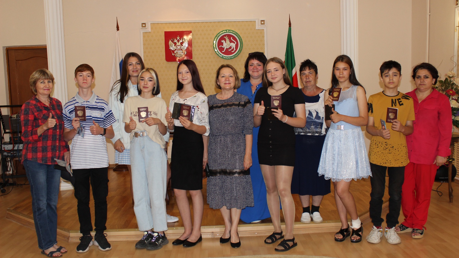 ГХАТ бүлеге җитәкчесе Сирена Мөрсәлимова яшьүсмерләрне Россия көне бәйрәмене, паспорт тарихы белән таныштырды. Яшь гражданнарны котлап паспортлар тапшырды.