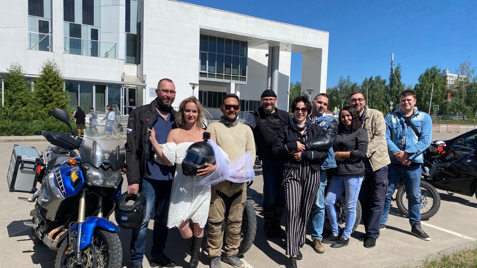 Җәйге туй - яшь парлар өчен тулы бер хыял. Мотоциклларда Сергей һәм Алена Шевчук туй фотосы.