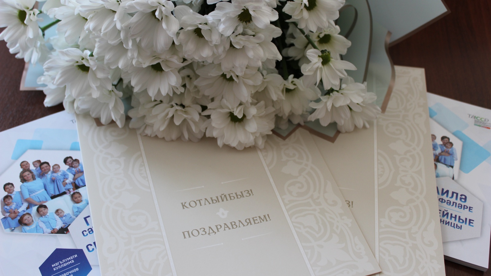 ГХАТ бүлеге хезмәткәрләре бәхетле гаиләне ихлас котлап туу турындагы таныклыклар һәм Татарстан Республикасы Президенты Р.Н.Миннехановның котлау адресын тапшырды.