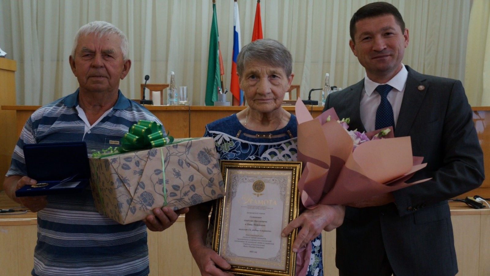 Бүләкләү тантанасы Гаилә, мәхәббәт һәм тугрылык көнендә узды. Юбилярларга медальне, грамотаны һәм бүләкне район башлыгы Кашапов Илһам Миңнехан улы тапшырды.