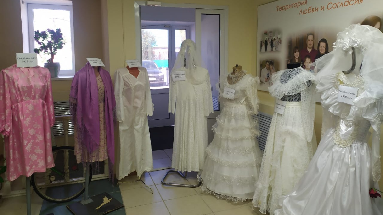 Экспонатларның һәрберсендә хуҗаларның бер модалы чоры һәм тапкырлыгы чагылды. 1950 еллар уртасында һәм ахырында кызлар янә туй тантанасына күлмәкләр тегәләр. Нигездә, зәңгәр, алсу һәм кремлы чәчәкләр киемнәрен өстен күрә. Кызларга кытлык вакытында скатерть һәм гипюр кисемнәреннән уникаль киемнәр ясау мөмкинлеге туды.