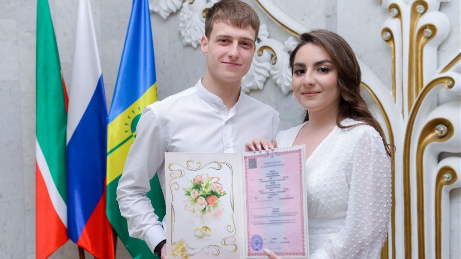 Түбән Кама никахлашу Сарае белгечләре яшь парга истәлекле китаплар һәм аларның беренче гаилә документы-никахлашу турында таныклык тапшырдылар.