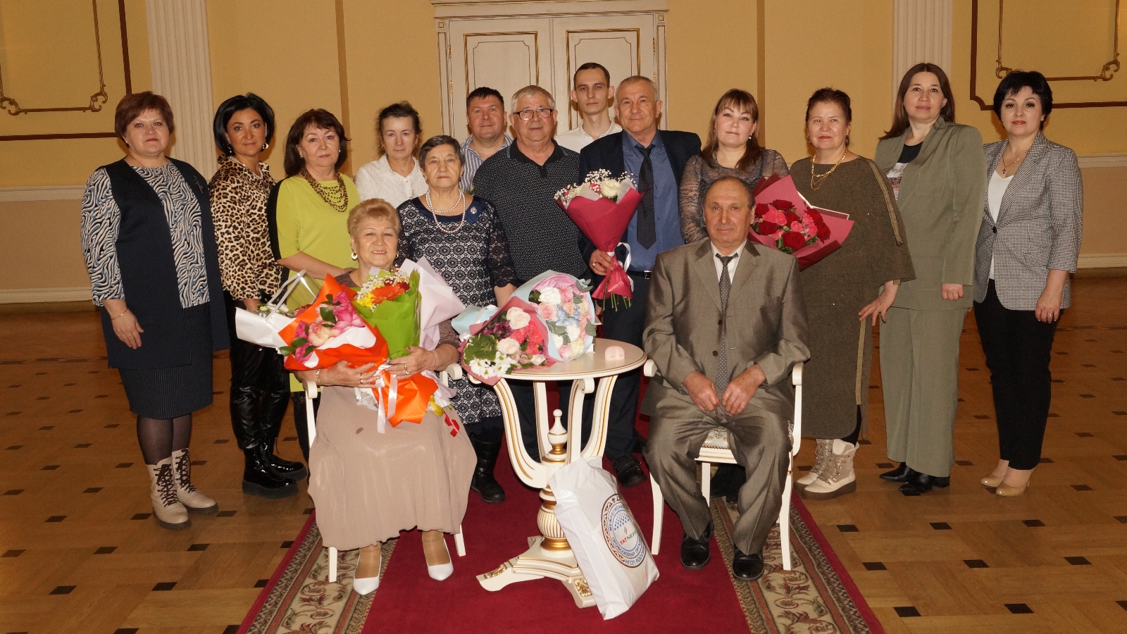 Күркәм традиция буенча, мәхәббәт һәм тугрылык билгесе итеп, юбилярлар балдаклар белән алмаштылар һәм Бөгелмә шәһәренең Мактаулы гаиләләре китабына үз имзаларын куйдылар. Гаиләне шәһәр җитәкчелеге исеменнән Бөгелмә муниципаль районы башкарма комитеты җитәкчесе урынбасары Гүзәл Рәхимова котлады, ул шәһәрнең юбилей медален тапшырды.