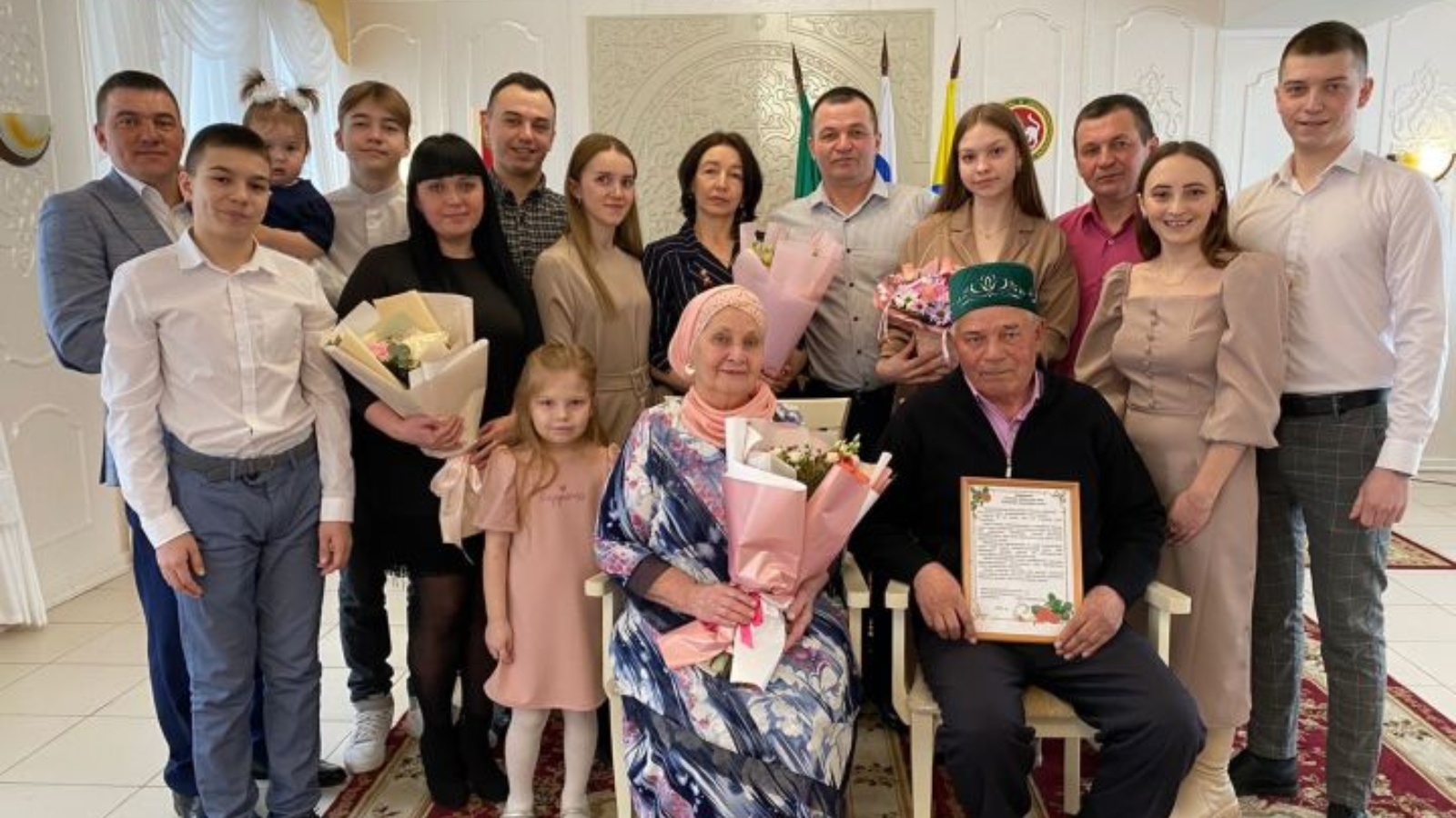 Әлки муниципаль районы башкарма комитеты ГХАТ бүлеге юбилярларны уртак гомерле бәйрәме белән котлады, бүләкләр тапшырды, ә Хәсәновлар районның мактаулы гаиләләре китабына имзаларын калдырдылар. Гаиләләренең туган көненә балалары да, оныклары һәм якын туганнары да килгән иде. Хәсәновларның барлык балалары бгары белем алып, районыбызда калганнар. Илмир белән Илдар – авыл хуҗалыгы белгечләре, кызлары Чулпан юристлыкка укый, әмма шулай ук аграр тармата эшли, ул “Россельхозцентр» белгече.