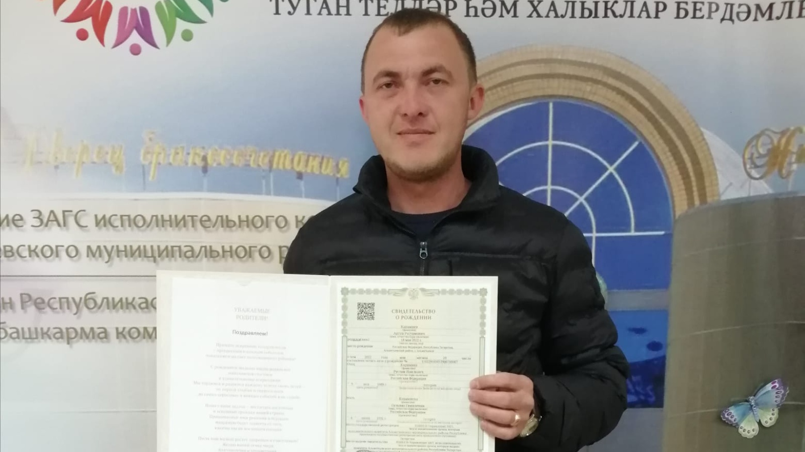 ГХАТ Идарәсе белгечләре бәхетле ата-ананы котлап, гаилә башлыгына баланың беренче дәүләт документын - туу турында таныклык һәм Татарстан Республикасы Президенты Р. Н. Миңнехановның котлау хатын тапшырдылар.