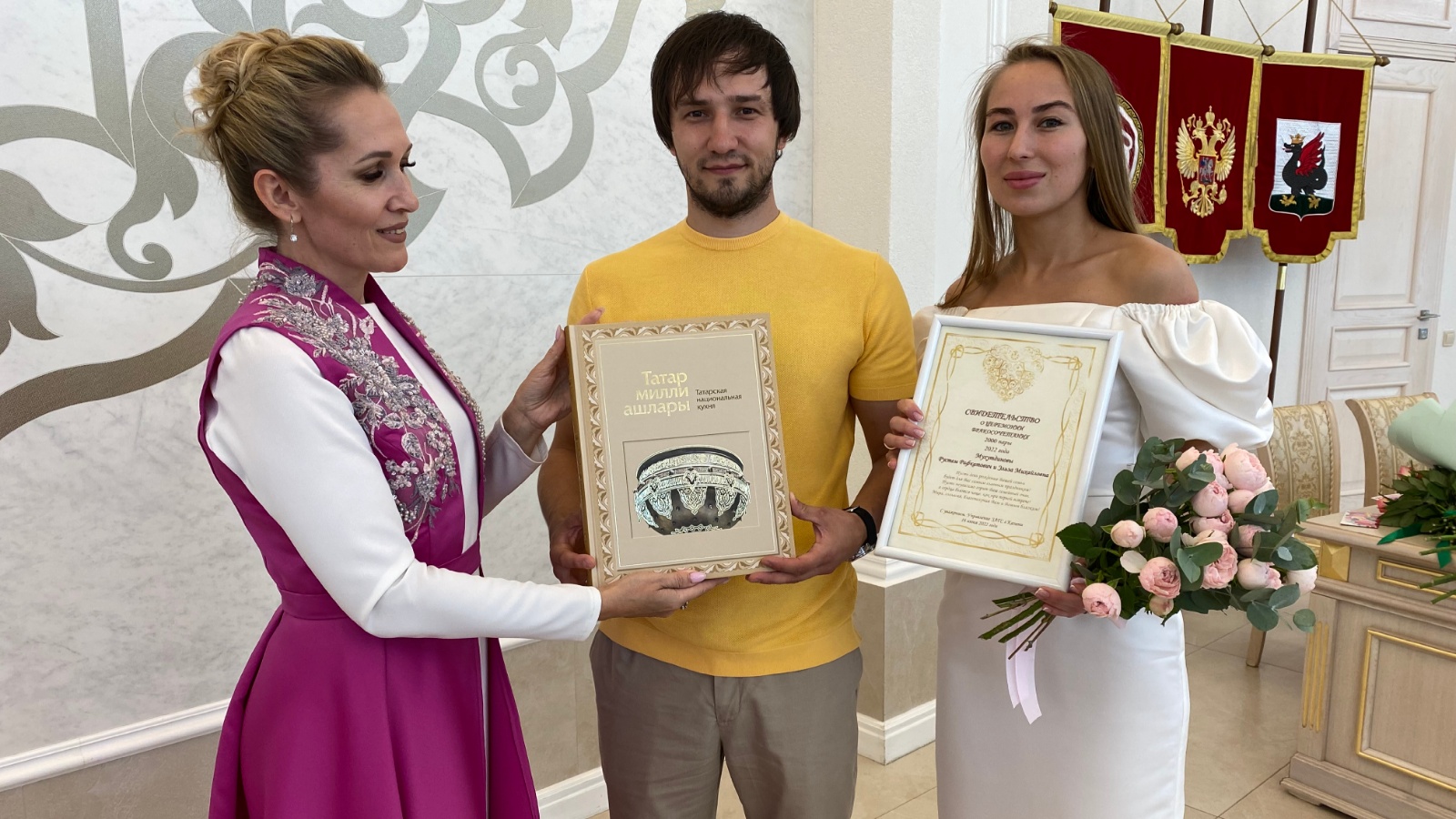 Бу бәхетле көнне яшь парлар никах теркәү таныклыгы белән бергә тантана турында сертификат һәм Казан шәһәре ГХАТ идарәсеннән истәлекле китап алдылар.