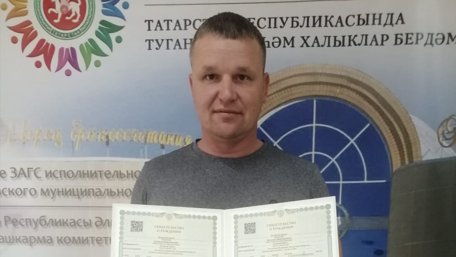ГХАТ Идарәсе белгечләре бәхетле ата-ананы котлап әтиләренә балаларның беренче дәүләт документларын – туу турында таныклыклар һәм Татарстан Республикасы Президенты Р. Н. Миңнехановның котлау хатларын тапшырдылар.