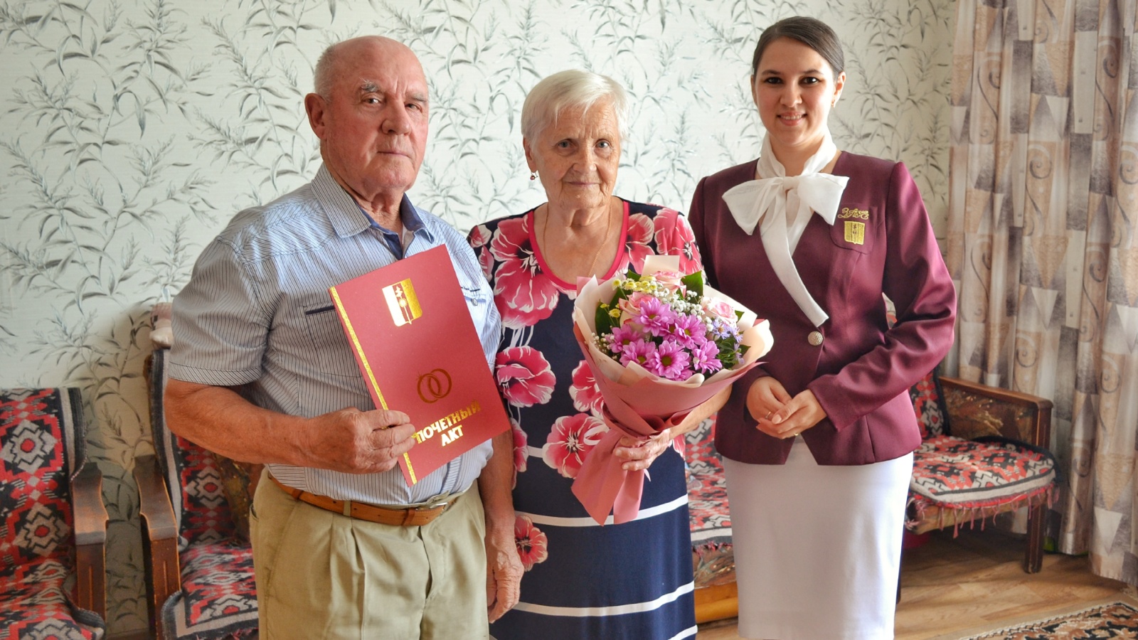 Бүген Юрий Константин улы һәм Валентина Федор кызы бриллиант туйларын билгеләп үтәләр. Алар башкаларга үрнәк булырдай гаилә корып ике кызларын тәрбияләп үстергәннәр. Кызлары аларга ике онык бүләк иткәннәр.