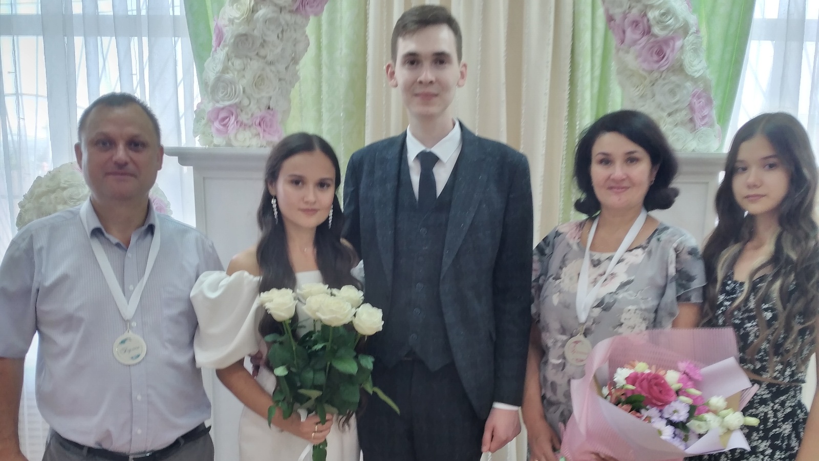 ЗАГС бүлеге хезмәткәрләре яшь парларны котлап, аларга беренче гаилә документы – никах теркәү турында таныклык һәм ГХАТ бүлегенең символик бүләген тапшырдылар.