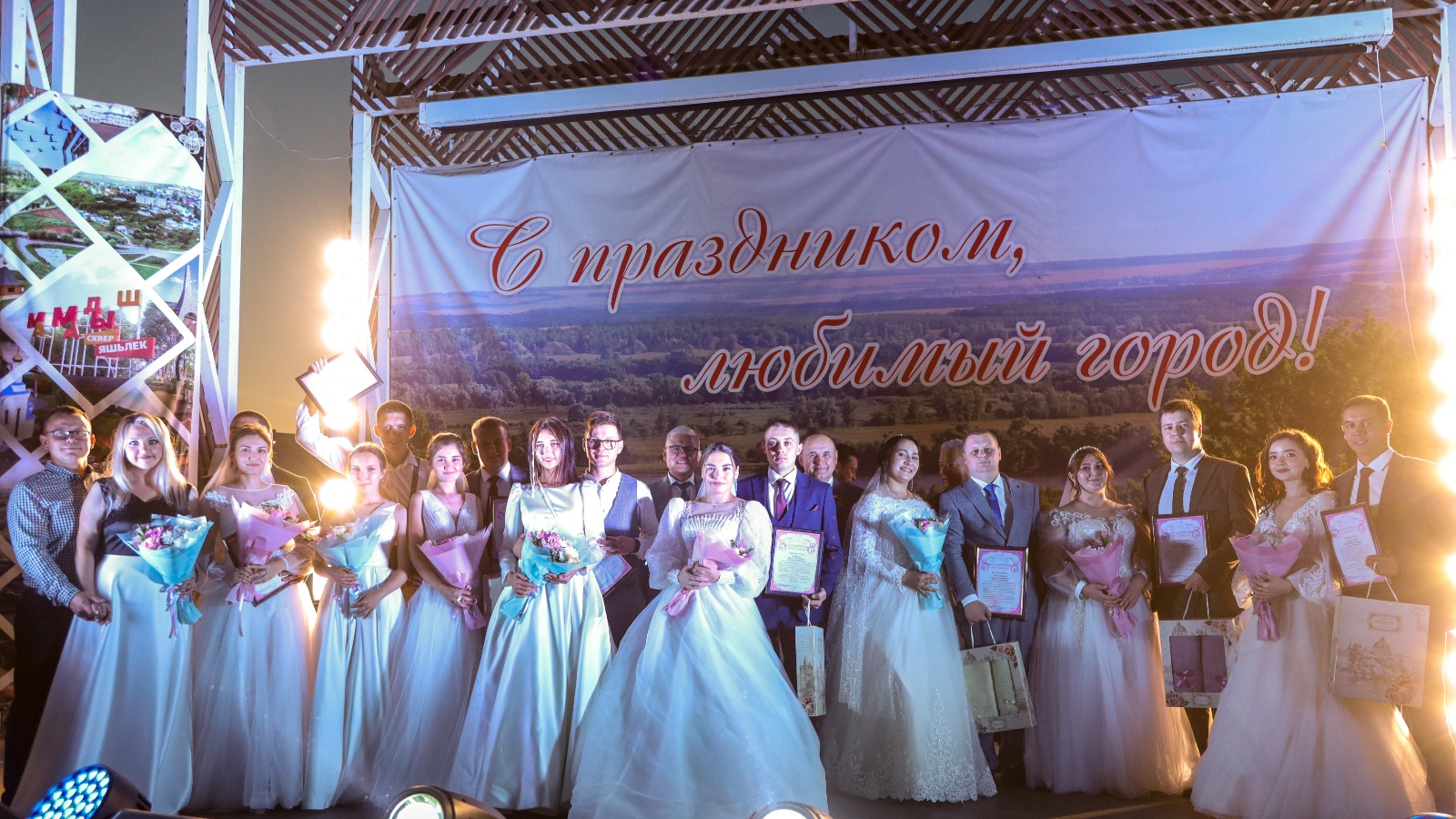 10 пар кияү һәм кәләш – мамадышлылар һәм килгән кунакларның игътибар үзәгендә булдылар. Яшьләрне гаилә төзүләре һәм шәһәр көне белән район башлыгы, VIII чакырылыш Россия Федерациясе Федераль Собраниесе Дәүләт Думасы депутаты Рөстәм Галиулла улы Кәлимуллин, Татарстан Республикасы Дәүләт Советы депутаты Марат Ибраһим улы Галиев тәбрикләделәр, котлау хаты һәм истәлекле бүләкләр тапшырды.