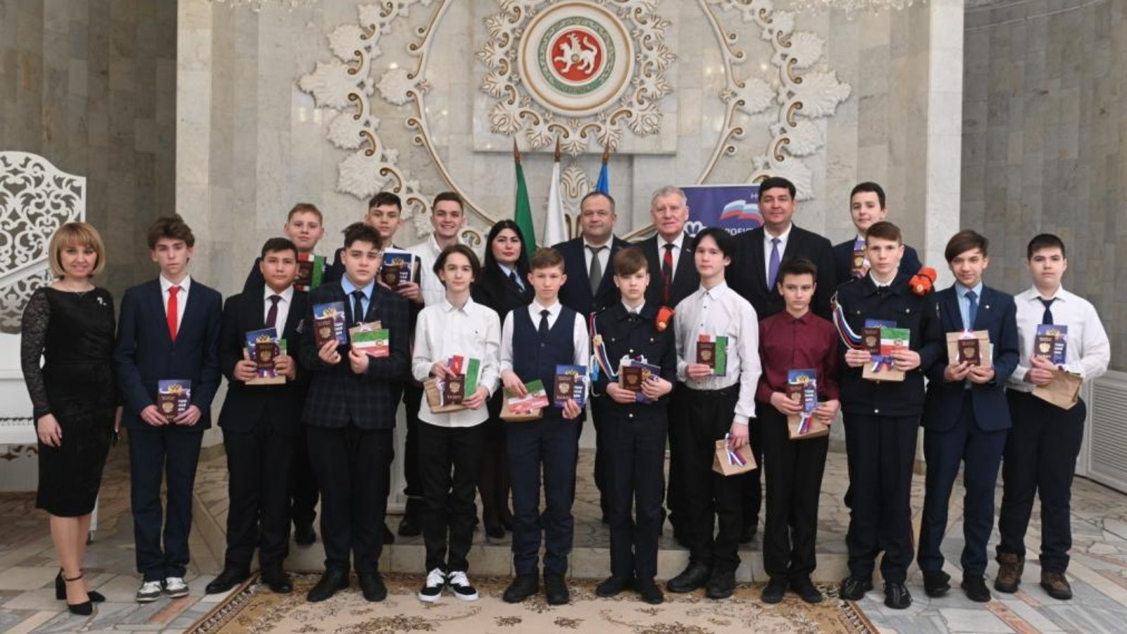 Традиция буенча, «Яшь гвардия» нең Түбән Кама бүлеге җитәкчесе Рөстәм Сәлахетдинов паспорт алучыларга Бердәм Россия партиясеннән истәлекле бүләкләр тапшырды.