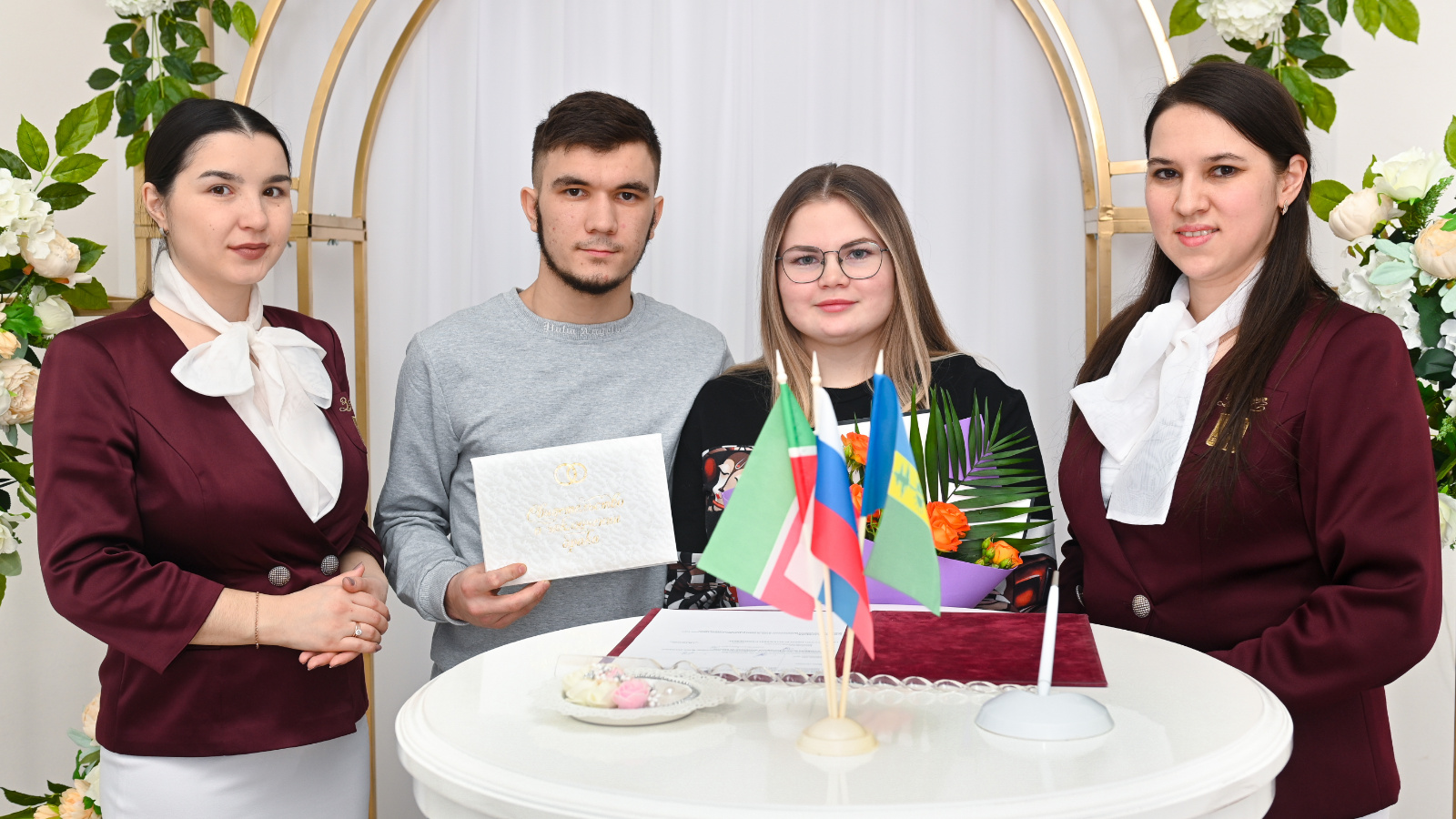 ГХАТ Идарәсе белгечләре Руслан белән Рәзиләне истәлекле вакыйгалары белән котладылар, беренче гаилә документларын – никахлашу турында таныклык һәм истәлекле китаплар тапшырдылар.