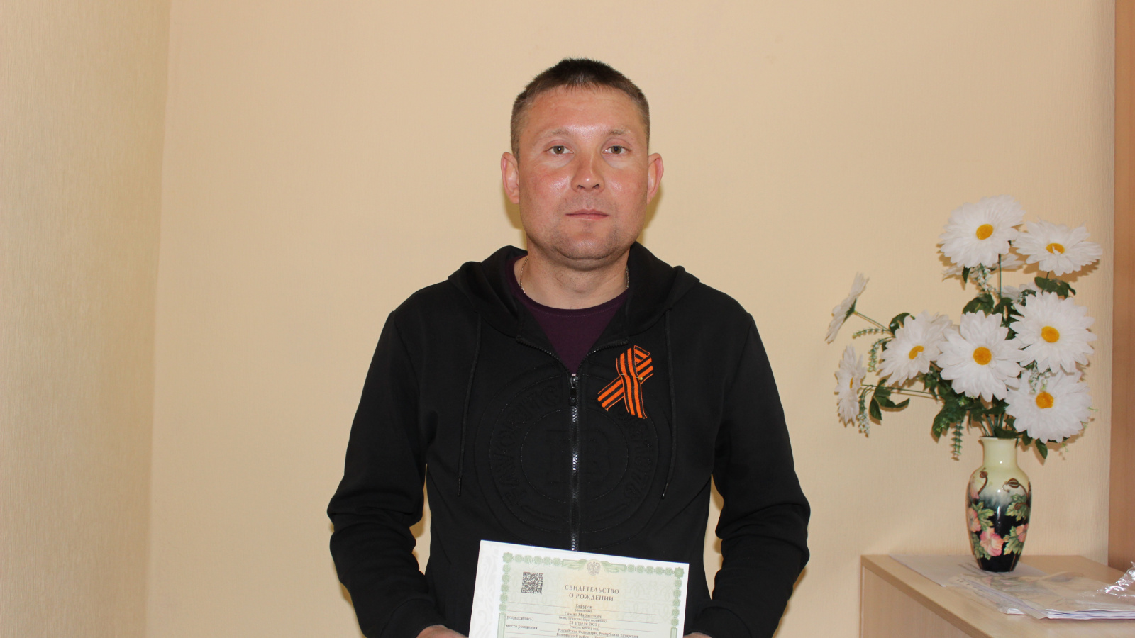 ГХАТ бүлеге башлыгы С. Т. Мурсалимова бәхетле әтине улы тууы белән җылы котлады, яңа туган баланың беренче документын – туу турында таныклыкны һәм георгий тасмасын тапшырды.