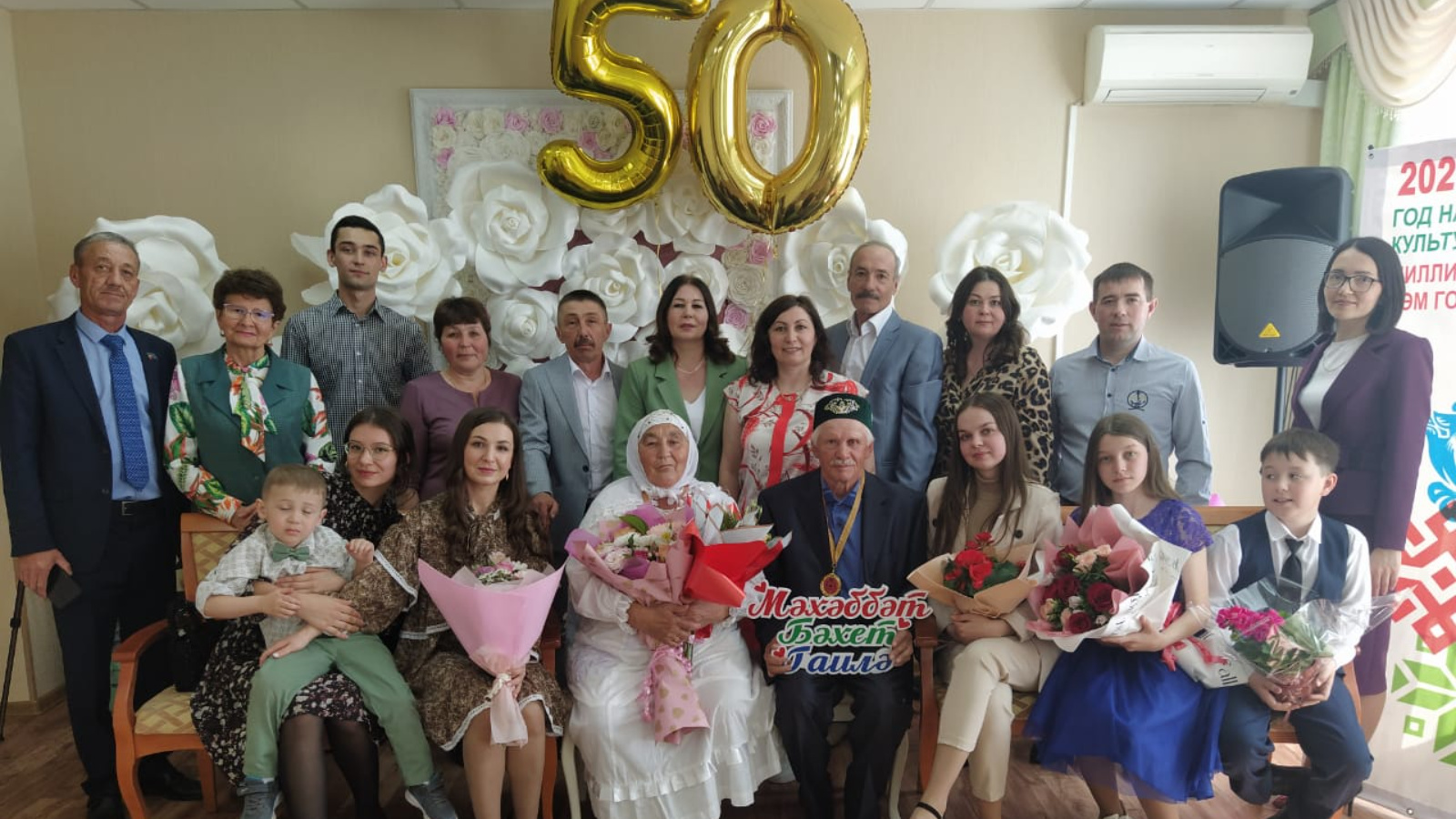 Районның хатын - кызлар советы рәисе Гатауллина А.М. бәйрәм шартларында район башлыгы И.Г.Нуриев исеменнән истәлекле бүләкләр һәм котлау адреслары тапшырды, җитәкченең районның мондый гаиләләре белән горурлануын билгеләп үтте. Юбилярларны бәйрәм белән Шушмабаш авыл җирлеге башлыгы В.В. Сәгыйтов, Шушмабаш авыл җирлеге белгече Шәйхетдинова М.Г. котладылар.