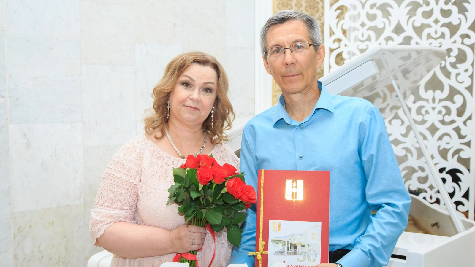 Ныклы сәламәтлек, иминлек һәм бәхет теләүләре белән ГХАТ идарәсе белгечләре аларга Мактаулы акт, истәлеккә китаплар һәм алтын юбилейга чакыру тапшырдылар.