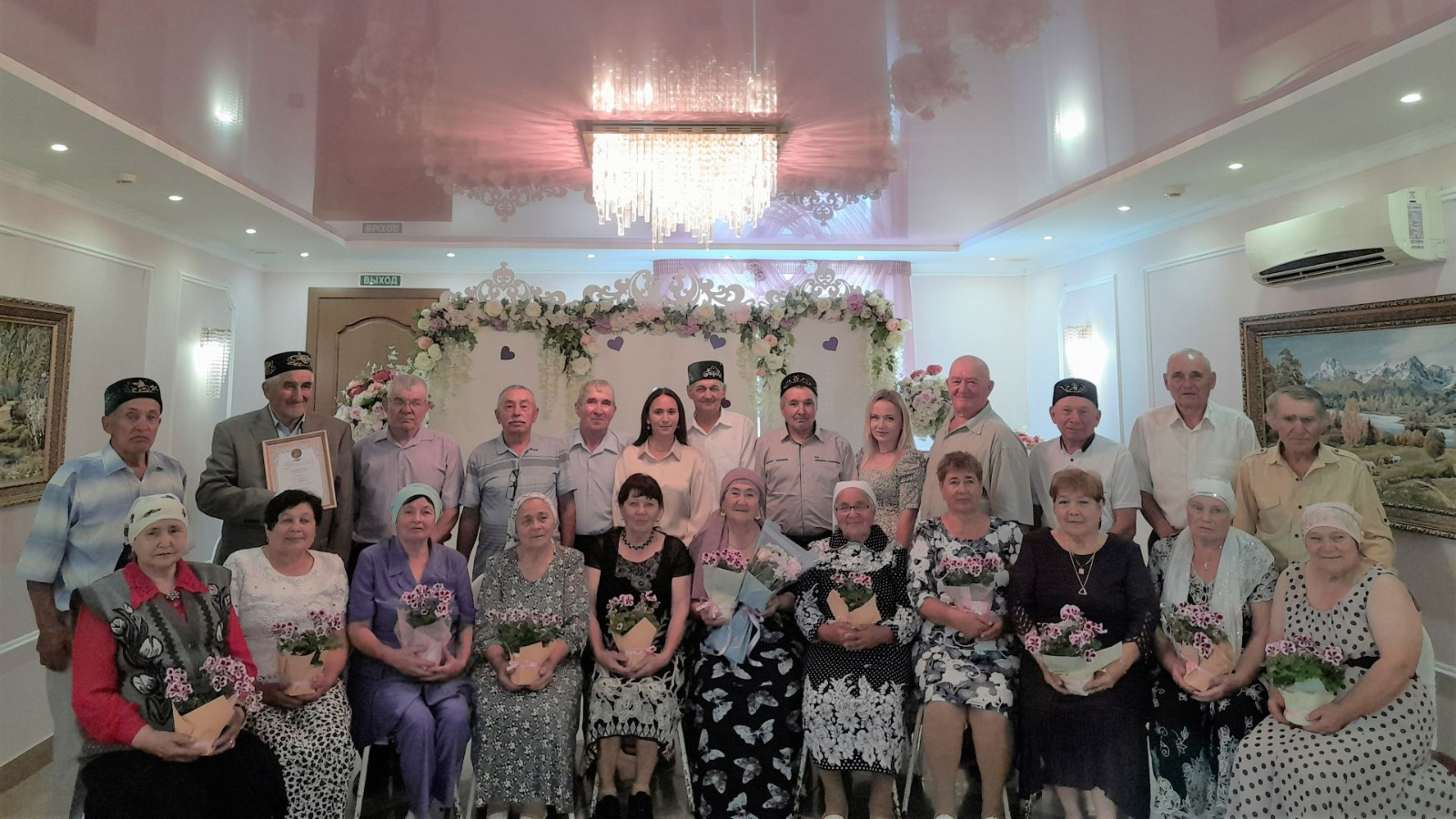 Гаилә кыйммәтләрен саклау, йолаларыбызны барлау йөзеннән 50 ел бергә яшәгән парлар белән район башлыгы Нәҗип Хаҗипов, район башкарма комитеты җитәкчесе Илнур Хамидуллин аралашты. Матур чәчәк бәйләмнәре, истәлекле бүләкләр парларыбызга аеруча җылылык белән тапшырылды. Юбилярларыбыз ГХАТ секторындагы истәлек китабына, яшь вакытларын искә алып, имзаларын теркәделәр.