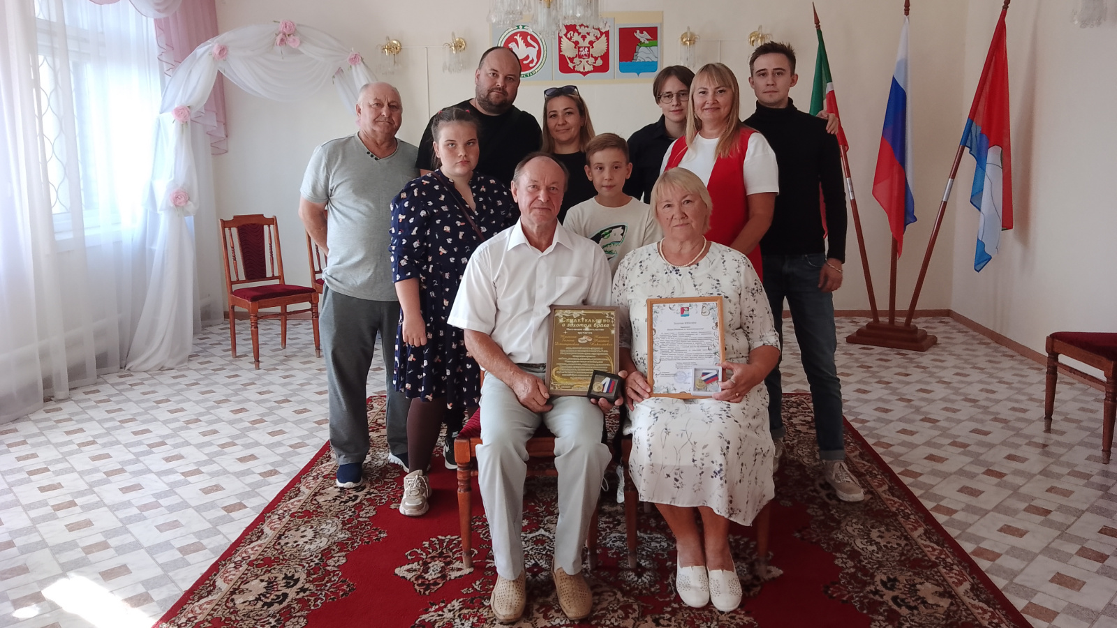 Бергә яшәүнең 50 еллыгы хөрмәтенә Тюшиннар гаиләсенең исемнәре «Районның гаилә тормышының мактаулы юбилярлары» китабына кертелде, анда алар үз имзаларын куйдылар. ГХАТ бүлеге башлыгы Наталья Кадыйрова юбилярларга сәламәтлек, игелек, тынычлык һәм тагын озак еллар бергә бәхетле гомер теләп Югары Ослан муниципаль районы башлыгы Марат Зиатдиновның Рәхмәт хатын һәм истәлекле бүләк тапшырды. Юбилярлар адресына балаларыннан һәм оныкларыннан бик күп җылы сүзләр әйтелде.