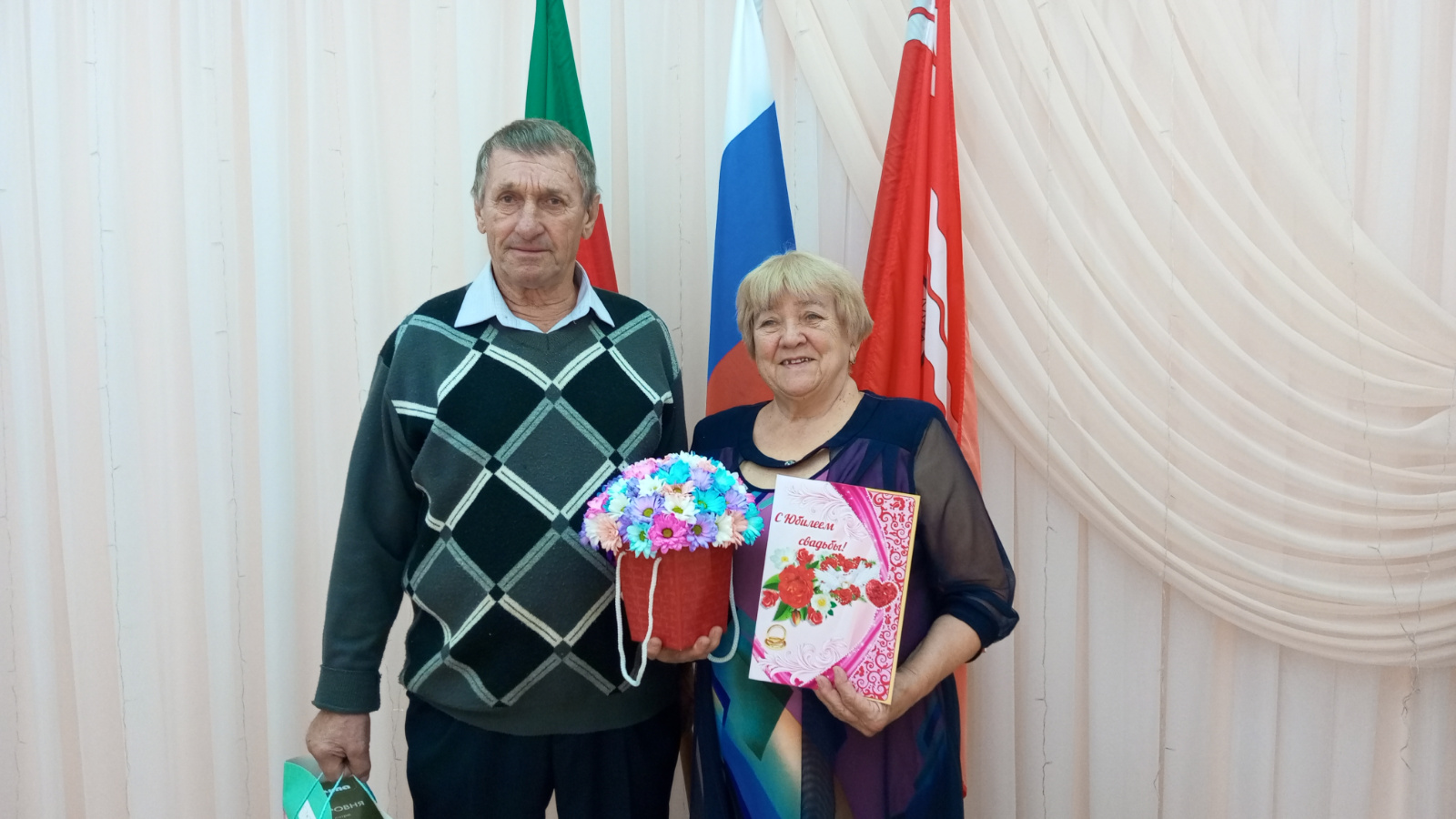 ЗАГС бүлеге начальнигы Л.М.Дианова ир белән хатынны район башлыгы Рәмис Хатыйп улы Сафиуллов исеменнән истәлекле дата белән котлады, котлау адресын һәм истәлекле сувенирын тапшырды.
