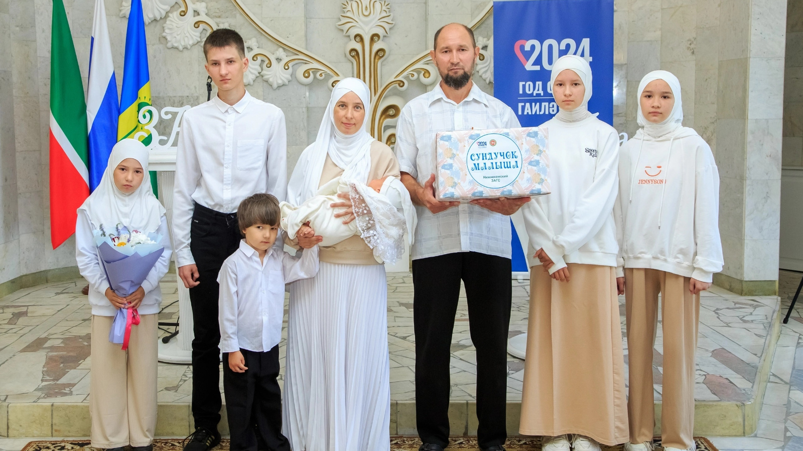 ГХАТ Идарәсе белгечләре сабыйның әти - әнисенә Татарстан Республикасы Рәисе Рөстәм Нургали улы Миңнехановның котлау адресын һәм бәйрәмнең төп символы-ромашка бәйләме тапшырдылар.